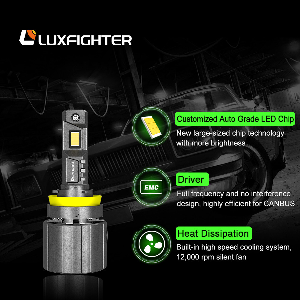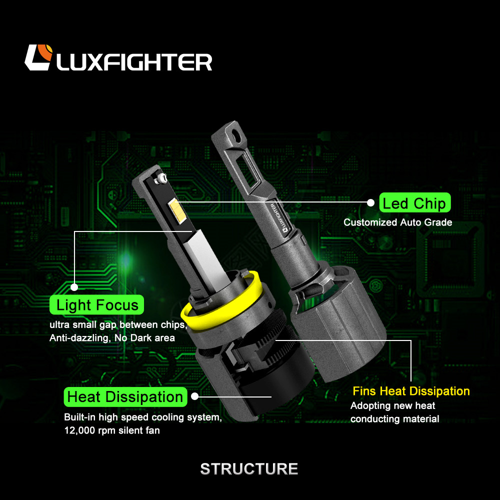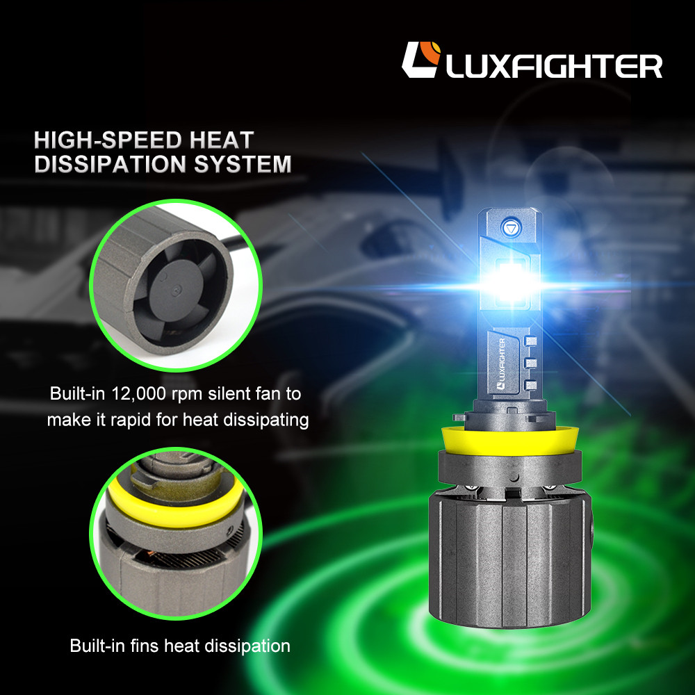 3. Trigubo šilumos išsklaidymo dizainas: 12 000 aps./min. Aušinimo ventiliatorius ir 90 laipsnių pasukimo šiluminis skystis. Šie šilumos išsklaidymo projektai leidžia „Luxfighter H7“ LED lempos gyvenimo trukmei viršyti 50 000 val.